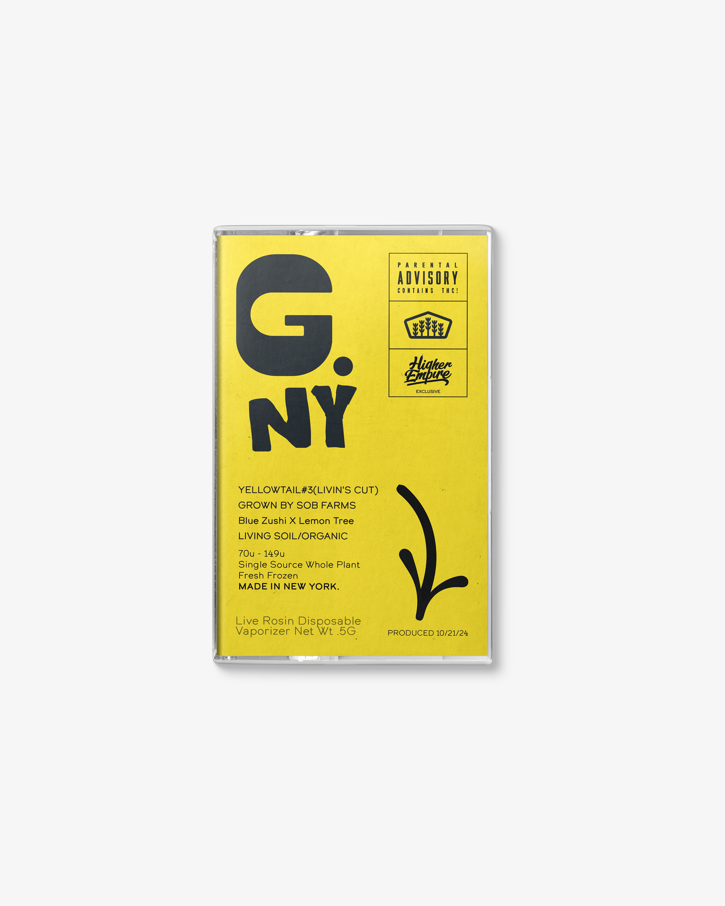Product Line Categories: Select a Category Concentrates Edibles Vaporizers Concentrates Edibles Vaporizers G.NY x Higher Empire Yellowtail #3 (LIVIN'S CUT) Live Rosin Disposable Vaporizer 0.5g Sold Out G.NY Yellowtail #4 (Blue Zushi x Lemontree) Premium Live Rosin Concentrate 1G Sold Out G.NY Yellowtail Premium Live Rosin Gummies Sold Out
